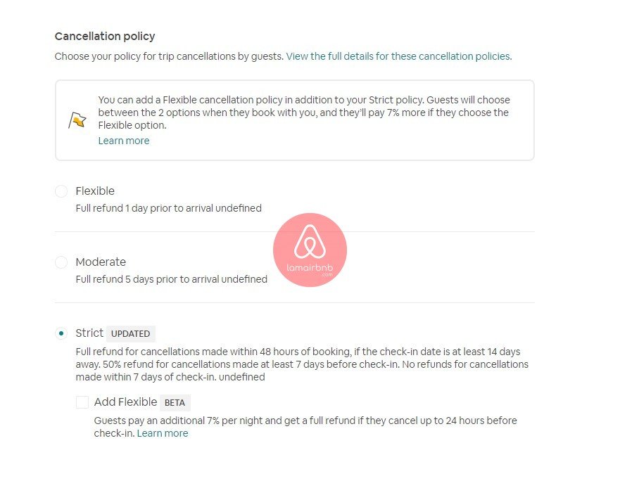 Chế độ con : Add Flexible in Strict : Chế độ này bảo rằng, khách sẽ phải trả thêm 7%/Billkhi chọn chế độ Flexible. VD : Khách đặt bạn 10 ngày, mỗi ngày $10 và đến ngày checkin 1 ngày, họ huỷ và họ phải trả cho bạn phí huỷ là 7% : $7.